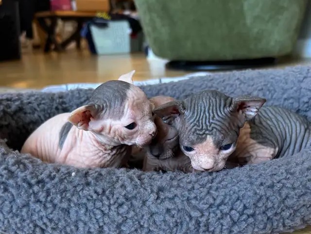 Mia just welcomed three charming baby boys—Max, Olaf, and Leo! These little Sphynx kittens are